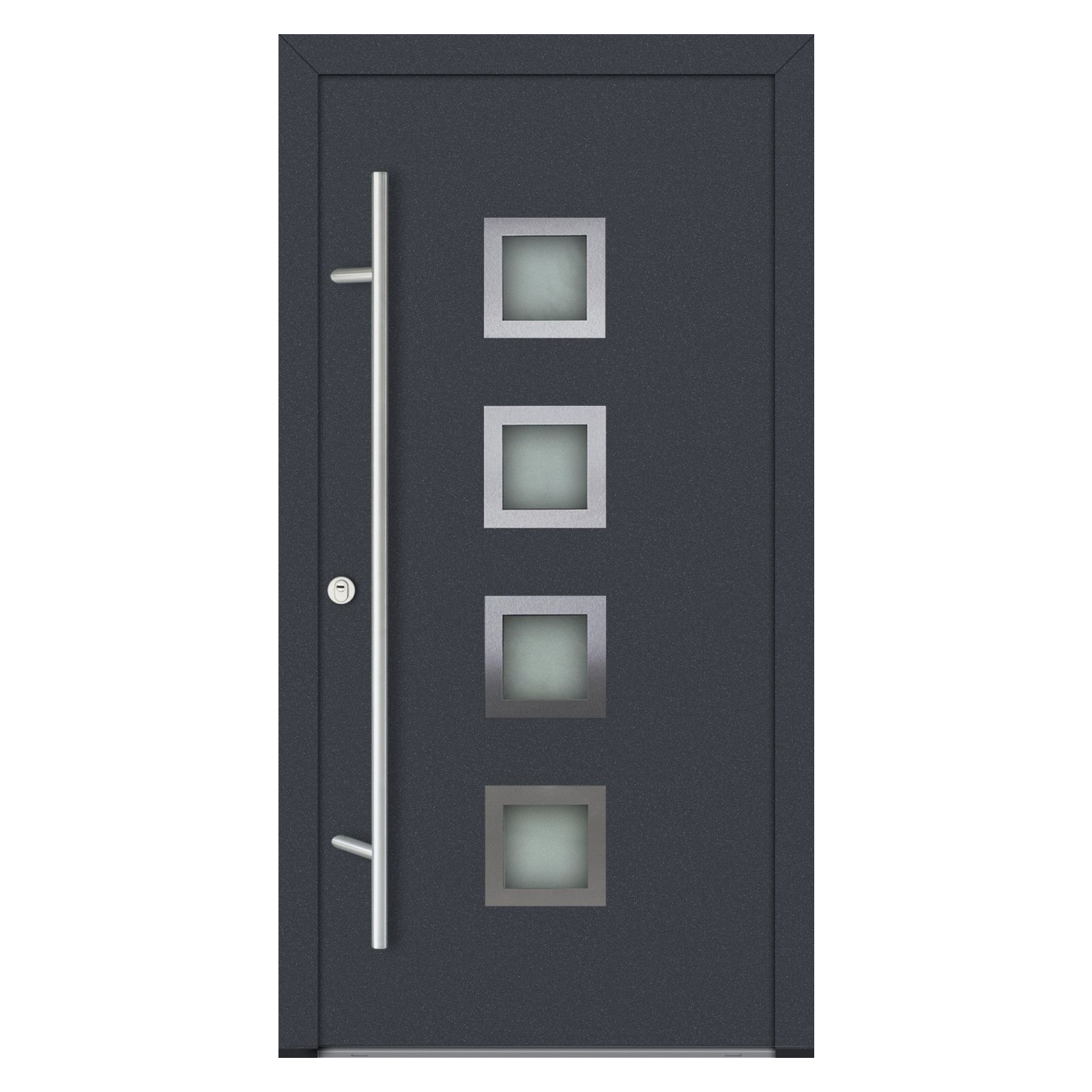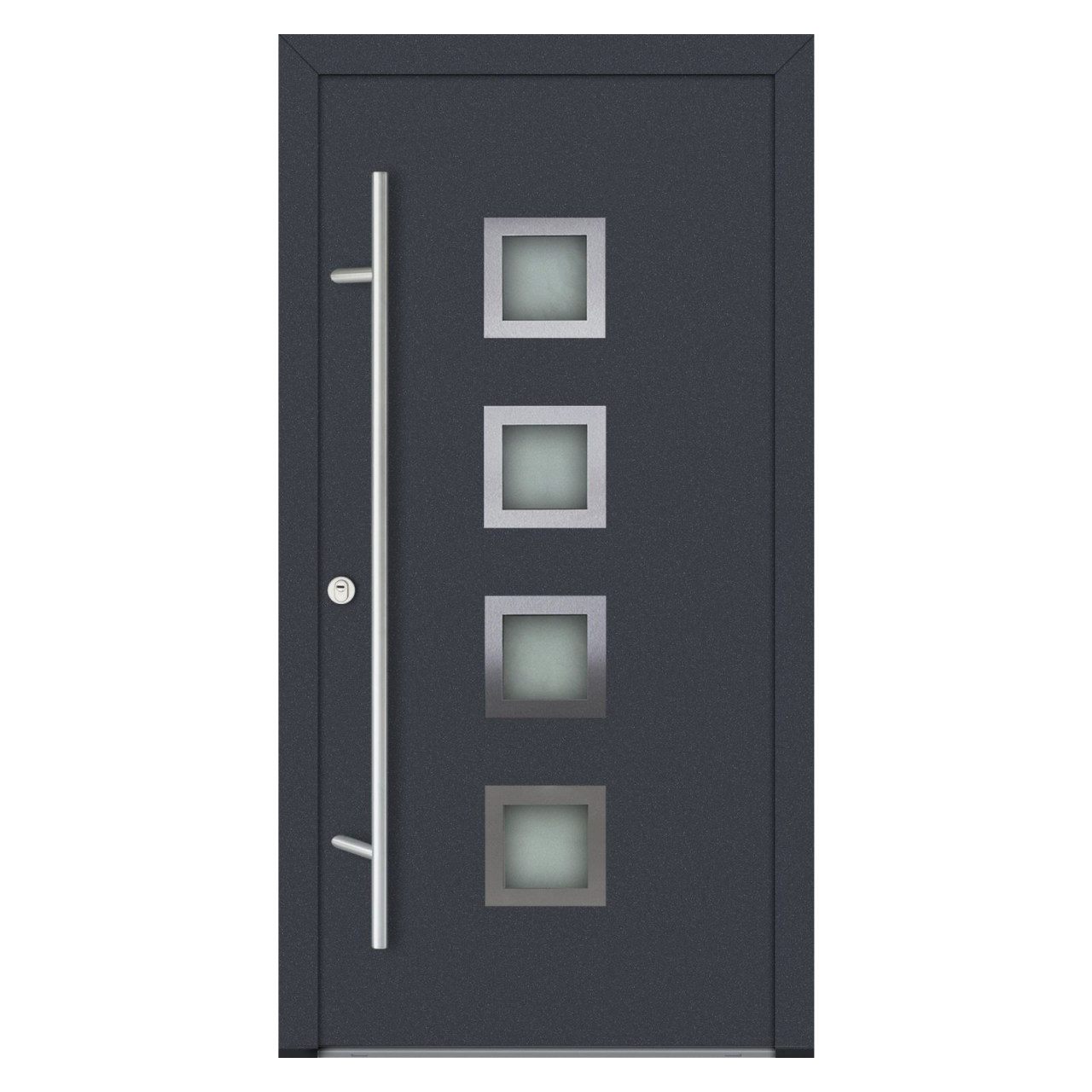 Modelul DS82 oferă o izolație termică avansată, cu performanțe de top în categorie: coeficient Ud de până la 0,68 W/m²K (fără vitralii) și 0,89 W/m²K (cu vitralii). Foaia de ușă are grosimea de 82 mm, iar cadrul din aluminiu cu barieră termică poate fi echipat, acolo unde se aplică, cu geam cvadruplu termoizolant, garantând eficiență energetică și confort optim. Pentru siguranță și stabilitate, ușa este dotată cu sistem de închidere Winkhaus în 5 puncte, broască cu cilindru și 5 chei, funcție antiefracție și antipanică, rozete cu protecție anti-găurire, tije anti-ridicare și balamale reglabile 3D. Designul poate fi personalizat în toată paleta de culori RAL, cu finisaje standard precum Antracit, Alb, Nuc, Stejar Auriu, Winchester sau Turner Oak. Opțional, se poate adăuga sticlă satinată sau gri grafit, oferind un plus de rafinament. Pragul din aluminiu cu barieră termică contribuie la confortul zilnic, iar opțional se poate integra o încuietoare electrică cu funcție zi/noapte. Ușa este compatibilă cu mânere premium, pentru interior și exterior. Produsă în UE pe o linie automatizată de fabricație, această ușă beneficiază de termene scurte de livrare și garanția calității oferite de Turenwerke.