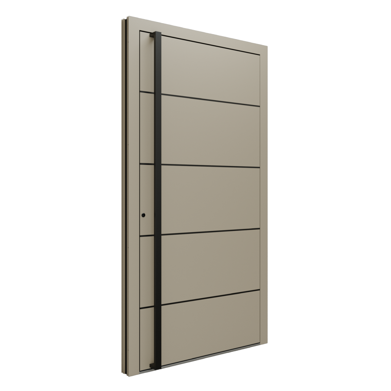 Modelul de ușă KB 290 este disponibil în orice culoare RAL și poate fi echipat cu mâner tip bară, rotund sau pătrat, în lungimi de 200 / 160 / 120 / 50 cm. Colecția Alu Basic aduce un design modern și minimalist, definit de frezări personalizate, linii curate și detalii elegante din oțel inoxidabil. Finisajele pot fi personalizate cu efect de lemn natural sau beton brut, oferind libertate deplină în crearea stilului dorit. Poți opta și pentru variante cu sticlă decorativă, adăugând un plus de lumină și rafinament intrării. Construcția din aluminiu, în grosimi de 75 mm sau 90 mm, asigură rezistență în timp și o izolație termică optimă (Ud până la 0,80 W/m²K). Sistemul de închidere multipunct, balamalele reglabile și pragul cu barieră termică garantează un plus de siguranță și confort zilnic.