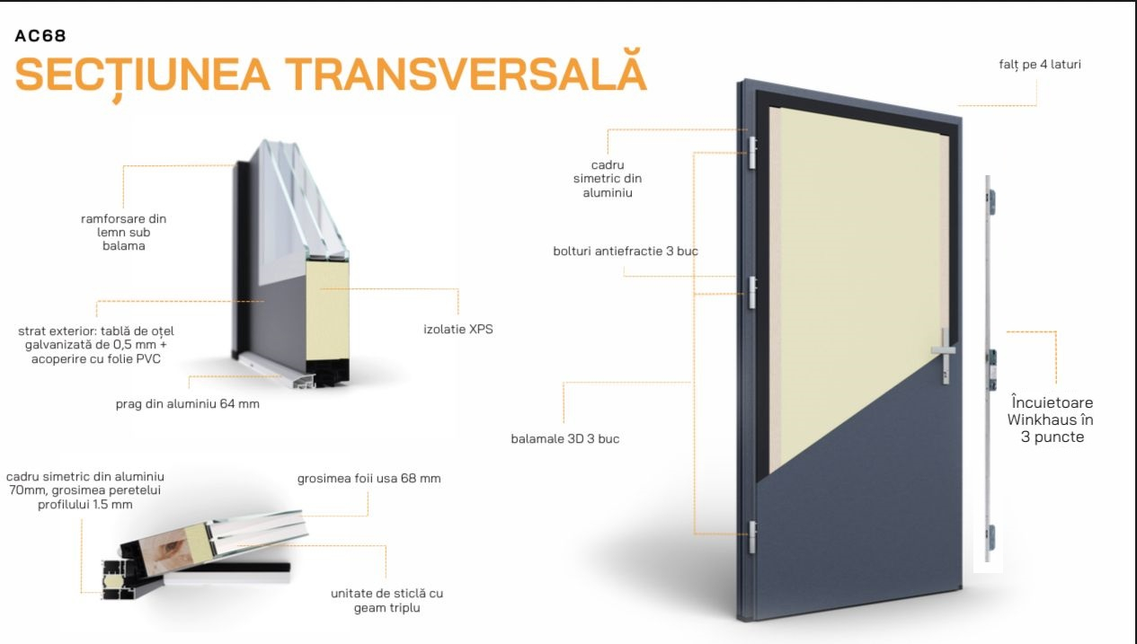 Modelul AC68 asigură o izolație termică eficientă, cu valori Ud de la 1,0 W/m²K (fără vitralii) și 1,2 W/m²K (cu vitralii). Foaia de ușă are grosimea de 68 mm, realizată din profil de plastic cu rupere termică, completată de un cadru din aluminiu cu barieră termică și geam triplu termoizolant cu distanțier cald (pentru modelele vitrate). Pentru siguranță și stabilitate, ușa este echipată cu sistem de închidere Winkhaus în 3 puncte, cilindru cu 5 chei și funcție antipanică, rozetă anti-găurire, protecții anti-ridicare și balamale reglabile 3D. Estetica este adaptabilă printr-o gamă variată de culori RAL și finisaje populare precum Alb, Antracit, Nuc, Stejar Auriu, Winchester sau Turner Oak. Opțional, se pot integra elemente vitrate cu sticlă satinată sau gri grafit, pentru un plus de lumină și rafinament. Confortul zilnic este susținut de pragul din aluminiu cu barieră termică și opțiunea pentru încuietoare electrică zi/noapte. Produs în UE, pe o linie automatizată de fabricație, acest model beneficiază de livrare rapidă și garanția calității.