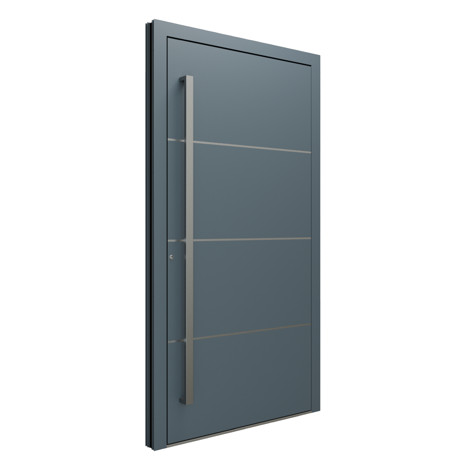 Modelul de ușă KB 1190 este disponibil în orice culoare RAL și poate fi echipat cu mâner tip bară, rotund sau pătrat, în lungimi de 200 / 160 / 120 / 50 cm. Colecția Alu Basic aduce un design modern și minimalist, definit de frezări personalizate, linii curate și detalii elegante din oțel inoxidabil. Finisajele pot fi personalizate cu efect de lemn natural sau beton brut, oferind libertate deplină în crearea stilului dorit. Poți opta și pentru variante cu sticlă decorativă, adăugând un plus de lumină și rafinament intrării. Construcția din aluminiu, în grosimi de 75 mm sau 90 mm, asigură rezistență în timp și o izolație termică optimă (Ud până la 0,80 W/m²K). Sistemul de închidere multipunct, balamalele reglabile și pragul cu barieră termică garantează un plus de siguranță și confort zilnic.