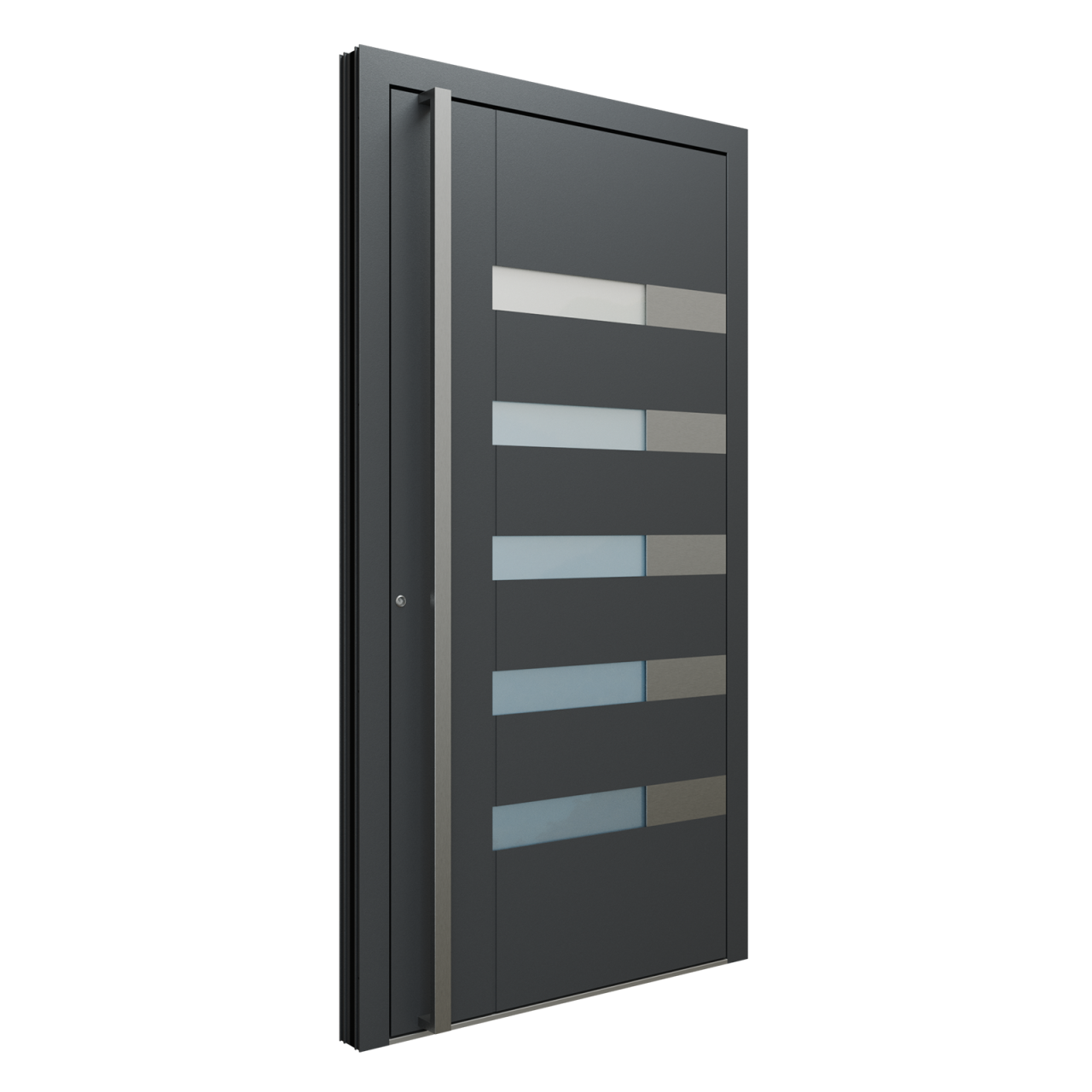 Modelul de ușă KB 1600 este disponibil în orice culoare RAL și poate fi echipat cu mâner tip bară, rotund sau pătrat, în lungimi de 200 / 160 / 120 / 50 cm. Colecția Alu Design aduce un design modern și minimalist, definit de frezări personalizate, linii curate și detalii elegante din oțel inoxidabil. Finisajele pot fi personalizate cu efect de lemn natural sau beton brut, oferind libertate deplină în crearea stilului dorit. Poți opta și pentru variante cu sticlă decorativă, adăugând un plus de lumină și rafinament intrării. Construcția din aluminiu, în grosimi de 75 mm sau 90 mm, asigură rezistență în timp și o izolație termică optimă (Ud până la 0,80 W/m²K). Sistemul de închidere multipunct, balamalele reglabile și pragul cu barieră termică garantează un plus de siguranță și confort zilnic.