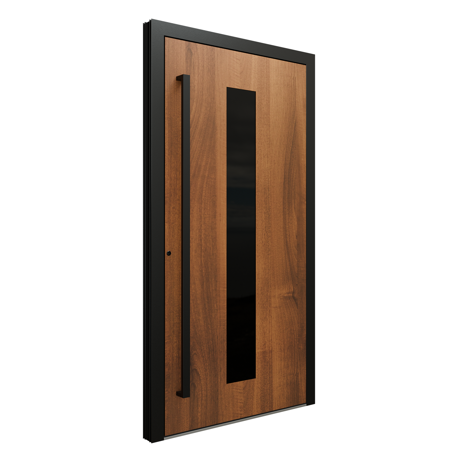 Design minimalist din aluminiu, în toate culorile RAL, grosimi de 75 mm sau 90 mm, și izolație termică Ud până la 0,80 W/m²K. Disponibilă cu frezări personalizate, finisaje tip lemn sau beton și opțiune de sticlă decorativă. Construită pentru rezistență, confort și estetică modernă.