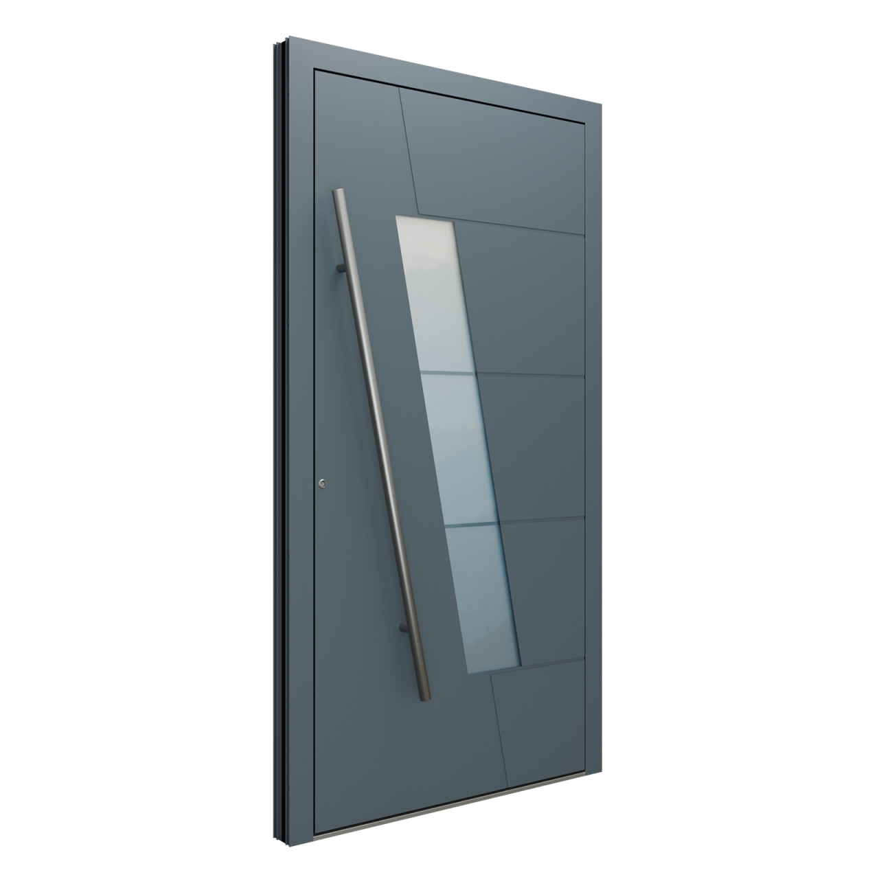 Modelul de ușă KB 440 este disponibil în orice culoare RAL și poate fi echipat cu mâner tip bară, rotund sau pătrat, în lungimi de 200 / 160 / 120 / 50 cm. Colecția Alu Design aduce un design modern și minimalist, definit de frezări personalizate, linii curate și detalii elegante din oțel inoxidabil. Finisajele pot fi personalizate cu efect de lemn natural sau beton brut, oferind libertate deplină în crearea stilului dorit. Poți opta și pentru variante cu sticlă decorativă, adăugând un plus de lumină și rafinament intrării. Construcția din aluminiu, în grosimi de 75 mm sau 90 mm, asigură rezistență în timp și o izolație termică optimă (Ud până la 0,80 W/m²K). Sistemul de închidere multipunct, balamalele reglabile și pragul cu barieră termică garantează un plus de siguranță și confort zilnic.