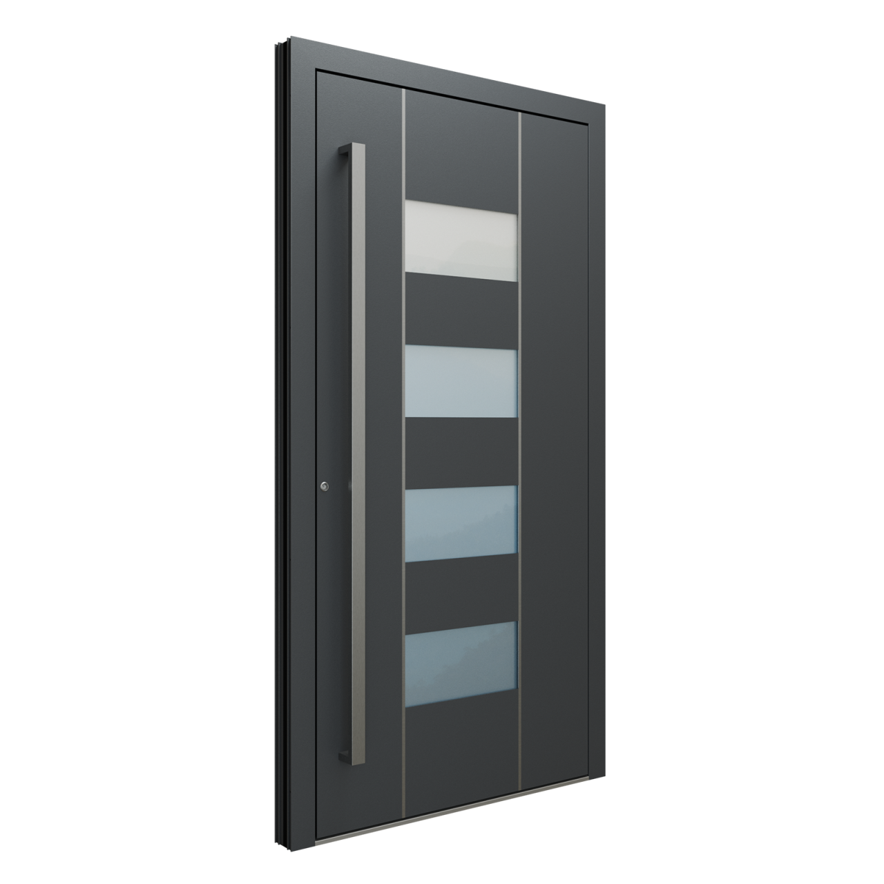 Modelul de ușă KB 580 este disponibil în orice culoare RAL și poate fi echipat cu mâner tip bară, rotund sau pătrat, în lungimi de 200 / 160 / 120 / 50 cm. Colecția Alu Design aduce un design modern și minimalist, definit de frezări personalizate, linii curate și detalii elegante din oțel inoxidabil. Finisajele pot fi personalizate cu efect de lemn natural sau beton brut, oferind libertate deplină în crearea stilului dorit. Poți opta și pentru variante cu sticlă decorativă, adăugând un plus de lumină și rafinament intrării. Construcția din aluminiu, în grosimi de 75 mm sau 90 mm, asigură rezistență în timp și o izolație termică optimă (Ud până la 0,80 W/m²K). Sistemul de închidere multipunct, balamalele reglabile și pragul cu barieră termică garantează un plus de siguranță și confort zilnic.