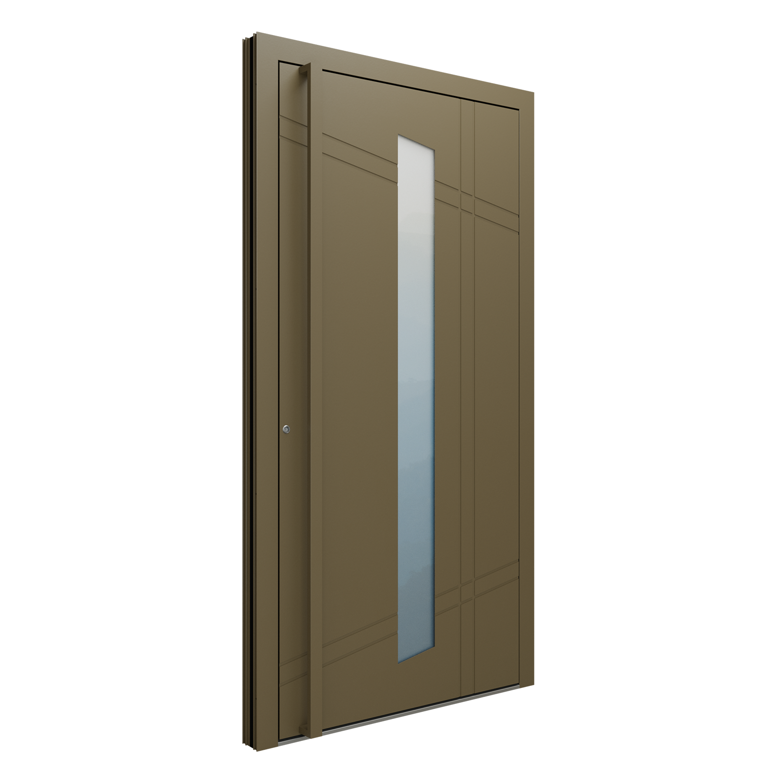 Design minimalist din aluminiu, în toate culorile RAL, grosimi de 75 mm sau 90 mm, și izolație termică Ud până la 0,80 W/m²K. Disponibilă cu frezări personalizate, finisaje tip lemn sau beton și opțiune de sticlă decorativă. Construită pentru rezistență, confort și estetică modernă.