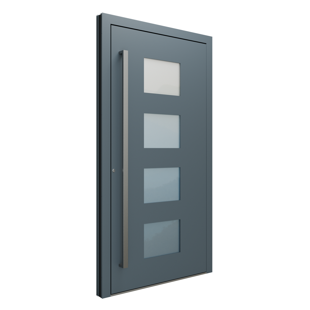 Modelul de ușă KB M211 este disponibil în orice culoare RAL și poate fi echipat cu mâner tip bară, rotund sau pătrat, în lungimi de 200 / 160 / 120 / 50 cm. Colecția Alu Design aduce un design modern și minimalist, definit de frezări personalizate, linii curate și detalii elegante din oțel inoxidabil. Finisajele pot fi personalizate cu efect de lemn natural sau beton brut, oferind libertate deplină în crearea stilului dorit. Poți opta și pentru variante cu sticlă decorativă, adăugând un plus de lumină și rafinament intrării. Construcția din aluminiu, în grosimi de 75 mm sau 90 mm, asigură rezistență în timp și o izolație termică optimă (Ud până la 0,80 W/m²K). Sistemul de închidere multipunct, balamalele reglabile și pragul cu barieră termică garantează un plus de siguranță și confort zilnic.