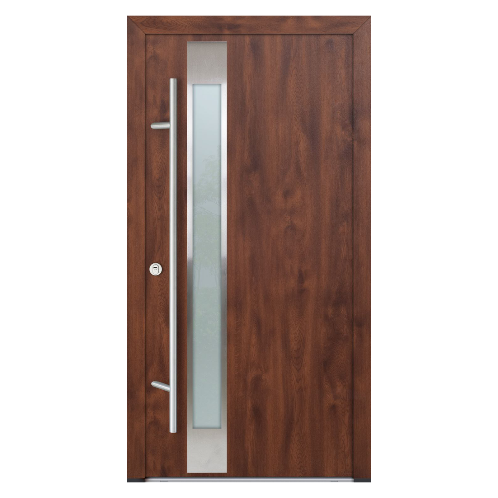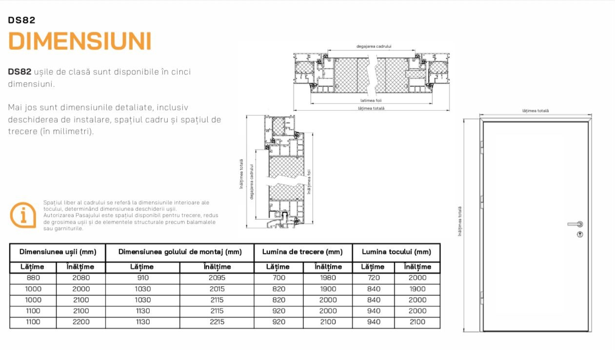 Modelul DS82 oferă o izolație termică avansată, cu performanțe de top în categorie: coeficient Ud de până la 0,68 W/m²K (fără vitralii) și 0,89 W/m²K (cu vitralii). Foaia de ușă are grosimea de 82 mm, iar cadrul din aluminiu cu barieră termică poate fi echipat, acolo unde se aplică, cu geam cvadruplu termoizolant, garantând eficiență energetică și confort optim. Pentru siguranță și stabilitate, ușa este dotată cu sistem de închidere Winkhaus în 5 puncte, broască cu cilindru și 5 chei, funcție antiefracție și antipanică, rozete cu protecție anti-găurire, tije anti-ridicare și balamale reglabile 3D. Designul poate fi personalizat în toată paleta de culori RAL, cu finisaje standard precum Antracit, Alb, Nuc, Stejar Auriu, Winchester sau Turner Oak. Opțional, se poate adăuga sticlă satinată sau gri grafit, oferind un plus de rafinament. Pragul din aluminiu cu barieră termică contribuie la confortul zilnic, iar opțional se poate integra o încuietoare electrică cu funcție zi/noapte. Ușa este compatibilă cu mânere premium, pentru interior și exterior. Produsă în UE pe o linie automatizată de fabricație, această ușă beneficiază de termene scurte de livrare și garanția calității oferite de Turenwerke.