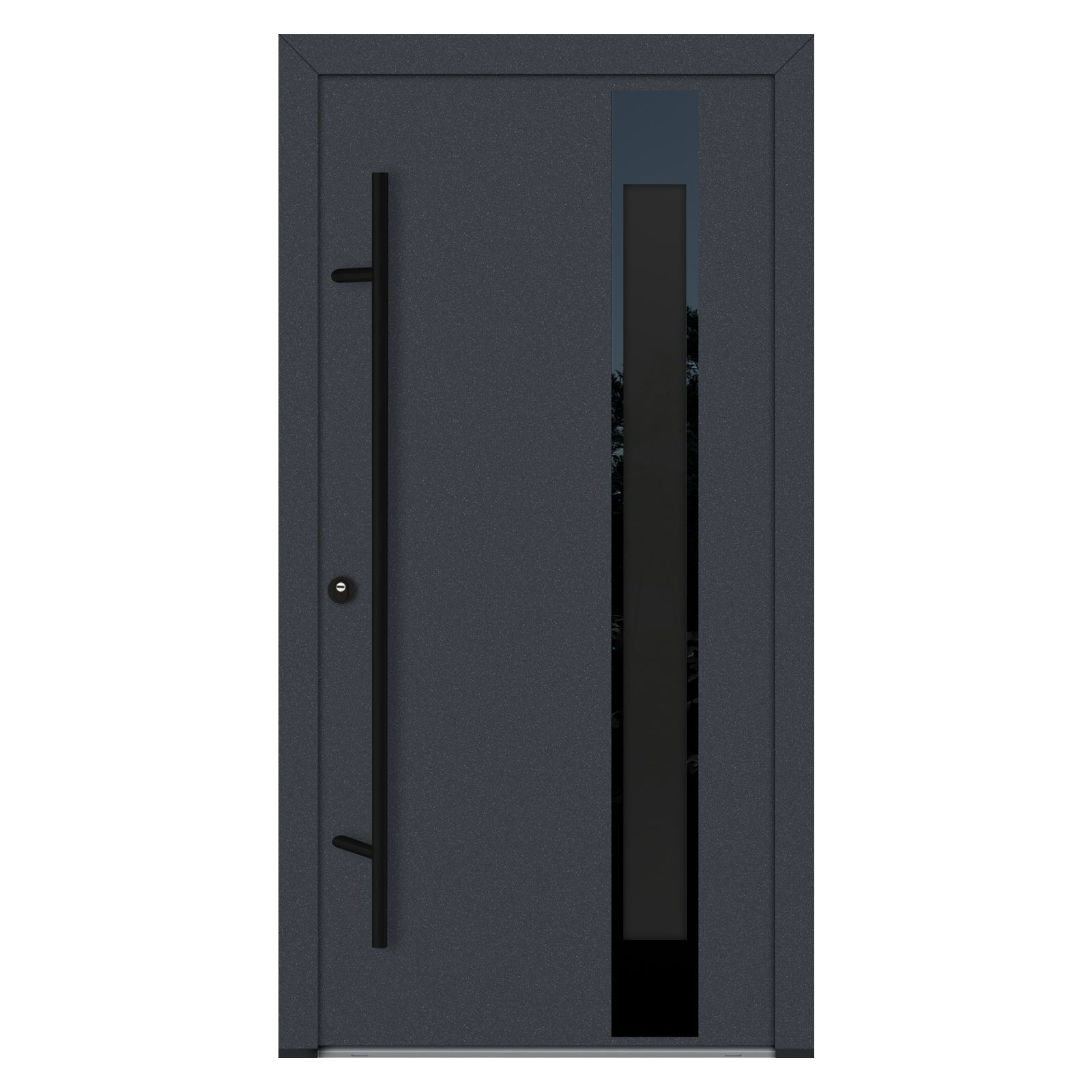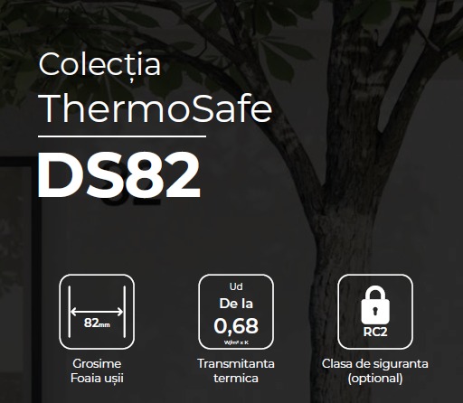 Modelul DS82 oferă o izolație termică avansată, cu performanțe de top în categorie: coeficient Ud de până la 0,68 W/m²K (fără vitralii) și 0,89 W/m²K (cu vitralii). Foaia de ușă are grosimea de 82 mm, iar cadrul din aluminiu cu barieră termică poate fi echipat, acolo unde se aplică, cu geam cvadruplu termoizolant, garantând eficiență energetică și confort optim. Pentru siguranță și stabilitate, ușa este dotată cu sistem de închidere Winkhaus în 5 puncte, broască cu cilindru și 5 chei, funcție antiefracție și antipanică, rozete cu protecție anti-găurire, tije anti-ridicare și balamale reglabile 3D. Designul poate fi personalizat în toată paleta de culori RAL, cu finisaje standard precum Antracit, Alb, Nuc, Stejar Auriu, Winchester sau Turner Oak. Opțional, se poate adăuga sticlă satinată sau gri grafit, oferind un plus de rafinament. Pragul din aluminiu cu barieră termică contribuie la confortul zilnic, iar opțional se poate integra o încuietoare electrică cu funcție zi/noapte. Ușa este compatibilă cu mânere premium, pentru interior și exterior. Produsă în UE pe o linie automatizată de fabricație, această ușă beneficiază de termene scurte de livrare și garanția calității oferite de Turenwerke.
