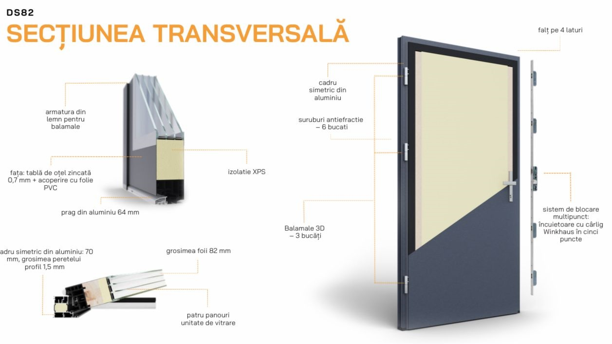 DS82 este o ușă de exterior cu izolație termică avansată și design modern. Acest model face parte din gama de top de uși de exterior, realizate din aluminiu și oțel, concepute pentru performanță termică, siguranță și un aspect elegant, potrivit atât pentru locuințe moderne, cât și pentru case clasice.