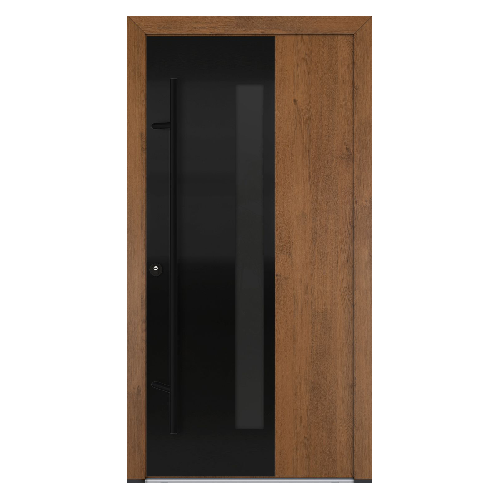 Modelul DS82 oferă o izolație termică avansată, cu performanțe de top în categorie: coeficient Ud de până la 0,68 W/m²K (fără vitralii) și 0,89 W/m²K (cu vitralii). Foaia de ușă are grosimea de 82 mm, iar cadrul din aluminiu cu barieră termică poate fi echipat, acolo unde se aplică, cu geam cvadruplu termoizolant, garantând eficiență energetică și confort optim. Pentru siguranță și stabilitate, ușa este dotată cu sistem de închidere Winkhaus în 5 puncte, broască cu cilindru și 5 chei, funcție antiefracție și antipanică, rozete cu protecție anti-găurire, tije anti-ridicare și balamale reglabile 3D. Designul poate fi personalizat în toată paleta de culori RAL, cu finisaje standard precum Antracit, Alb, Nuc, Stejar Auriu, Winchester sau Turner Oak. Opțional, se poate adăuga sticlă satinată sau gri grafit, oferind un plus de rafinament. Pragul din aluminiu cu barieră termică contribuie la confortul zilnic, iar opțional se poate integra o încuietoare electrică cu funcție zi/noapte. Ușa este compatibilă cu mânere premium, pentru interior și exterior. Produsă în UE pe o linie automatizată de fabricație, această ușă beneficiază de termene scurte de livrare și garanția calității oferite de Turenwerke.
