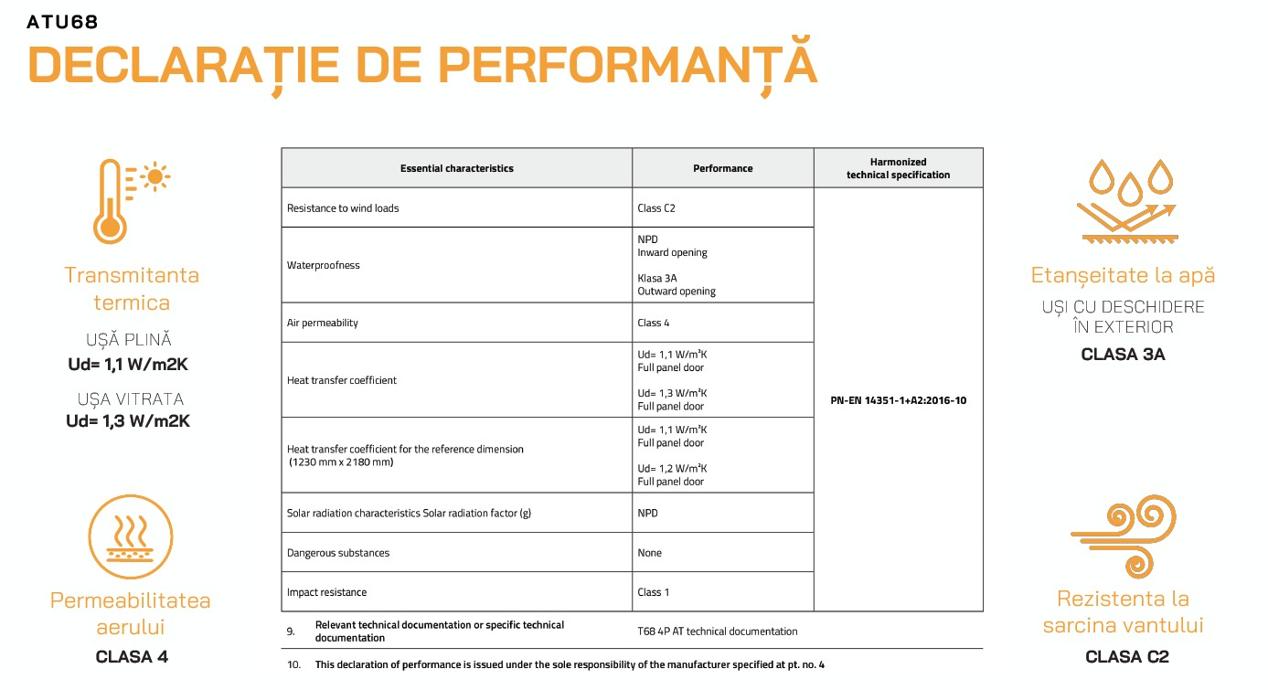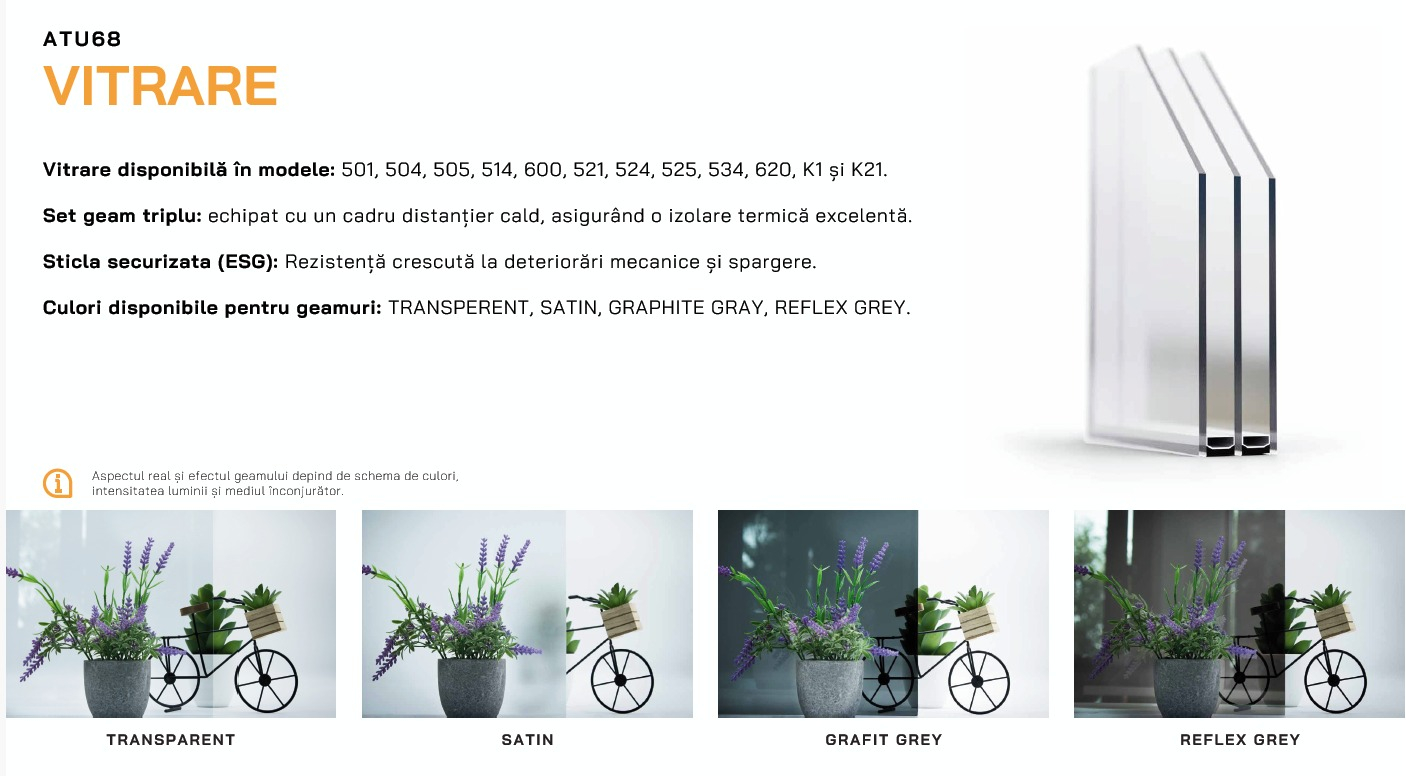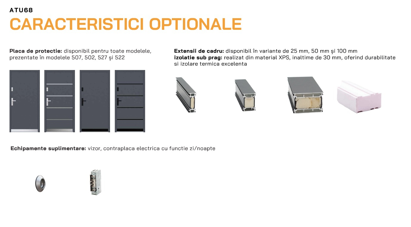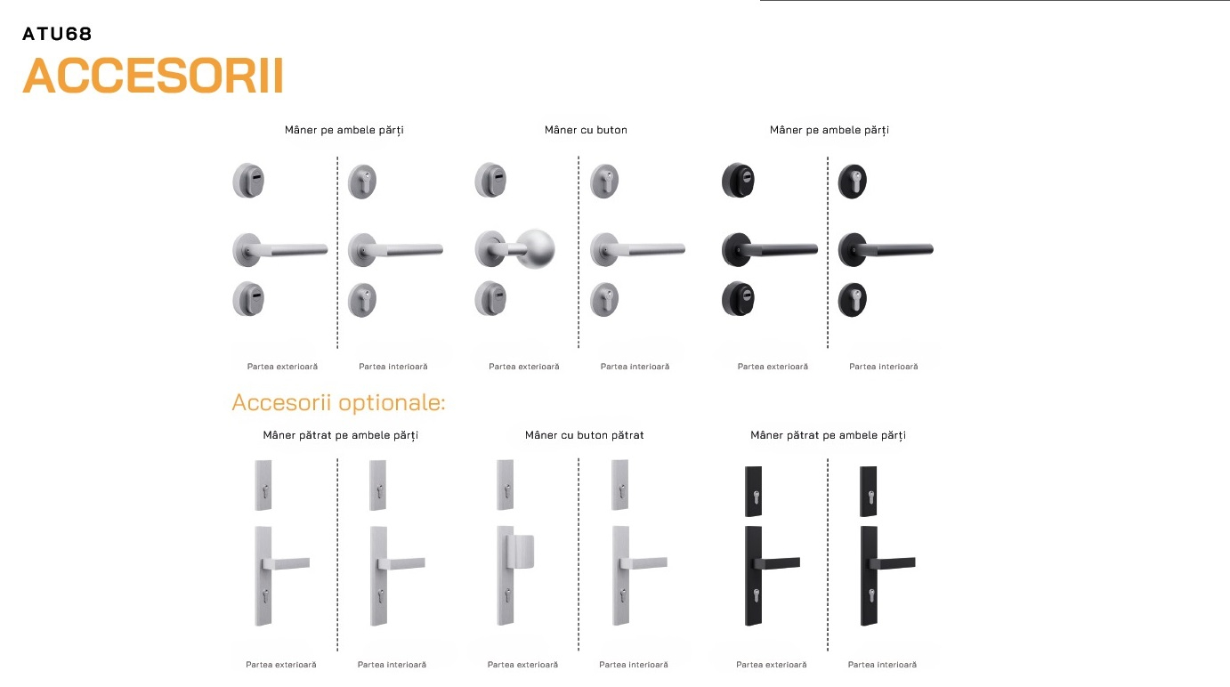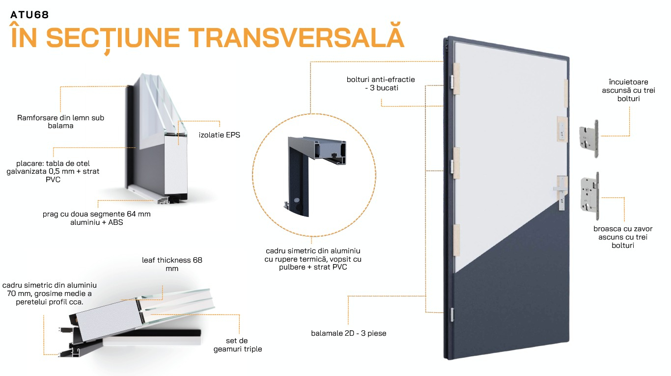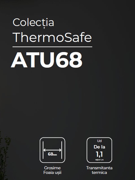 Modelul ATU68 cu izolație termică optimizată asigură o performanță eficientă, cu valoare Ud de la 1,1 W/m²K. Foaia de ușă are grosimea de 68 mm, placată cu oțel și completată de un cadru din aluminiu, iar acolo unde se aplică, poate fi echipată cu geam triplu termoizolant, pentru un plus de confort energetic. Pentru siguranță, ușa este dotată cu închidere mecanică de protecție cu tije și funcție antipanică, rozete anti-găurire și consolidări împotriva intrării forțate. Balamalele reglabile și pragul din aluminiu cu barieră termică sporesc rezistența și stabilitatea. Designul poate fi personalizat printr-o gamă de culori disponibile – Alb, Antracit, Nuc și Stejar Auriu – precum și prin opțiuni de vitrare cu sticlă Satin sau Gri Grafit. La nivel de confort și funcționalitate, ușa este compatibilă cu mânere pătrate sau rotunde, pentru interior și exterior, iar la cerere poate fi echipată cu închidere electrică sau broască automată. Produsă în Europa pe linii moderne de fabricație, această ușă beneficiază de termene scurte de livrare și garanție completă pentru toate componentele.