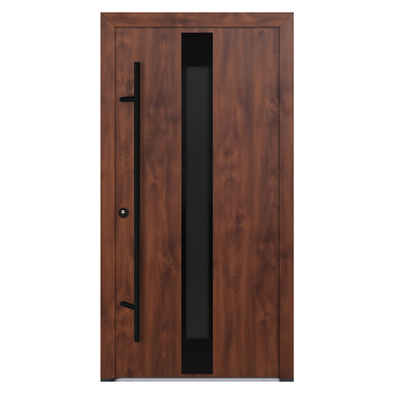 Modelul DS82 oferă o izolație termică avansată, cu performanțe de top în categorie: coeficient Ud de până la 0,68 W/m²K (fără vitralii) și 0,89 W/m²K (cu vitralii). Foaia de ușă are grosimea de 82 mm, iar cadrul din aluminiu cu barieră termică poate fi echipat, acolo unde se aplică, cu geam cvadruplu termoizolant, garantând eficiență energetică și confort optim. Pentru siguranță și stabilitate, ușa este dotată cu sistem de închidere Winkhaus în 5 puncte, broască cu cilindru și 5 chei, funcție antiefracție și antipanică, rozete cu protecție anti-găurire, tije anti-ridicare și balamale reglabile 3D. Designul poate fi personalizat în toată paleta de culori RAL, cu finisaje standard precum Antracit, Alb, Nuc, Stejar Auriu, Winchester sau Turner Oak. Opțional, se poate adăuga sticlă satinată sau gri grafit, oferind un plus de rafinament. Pragul din aluminiu cu barieră termică contribuie la confortul zilnic, iar opțional se poate integra o încuietoare electrică cu funcție zi/noapte. Ușa este compatibilă cu mânere premium, pentru interior și exterior. Produsă în UE pe o linie automatizată de fabricație, această ușă beneficiază de termene scurte de livrare și garanția calității oferite de Turenwerke.